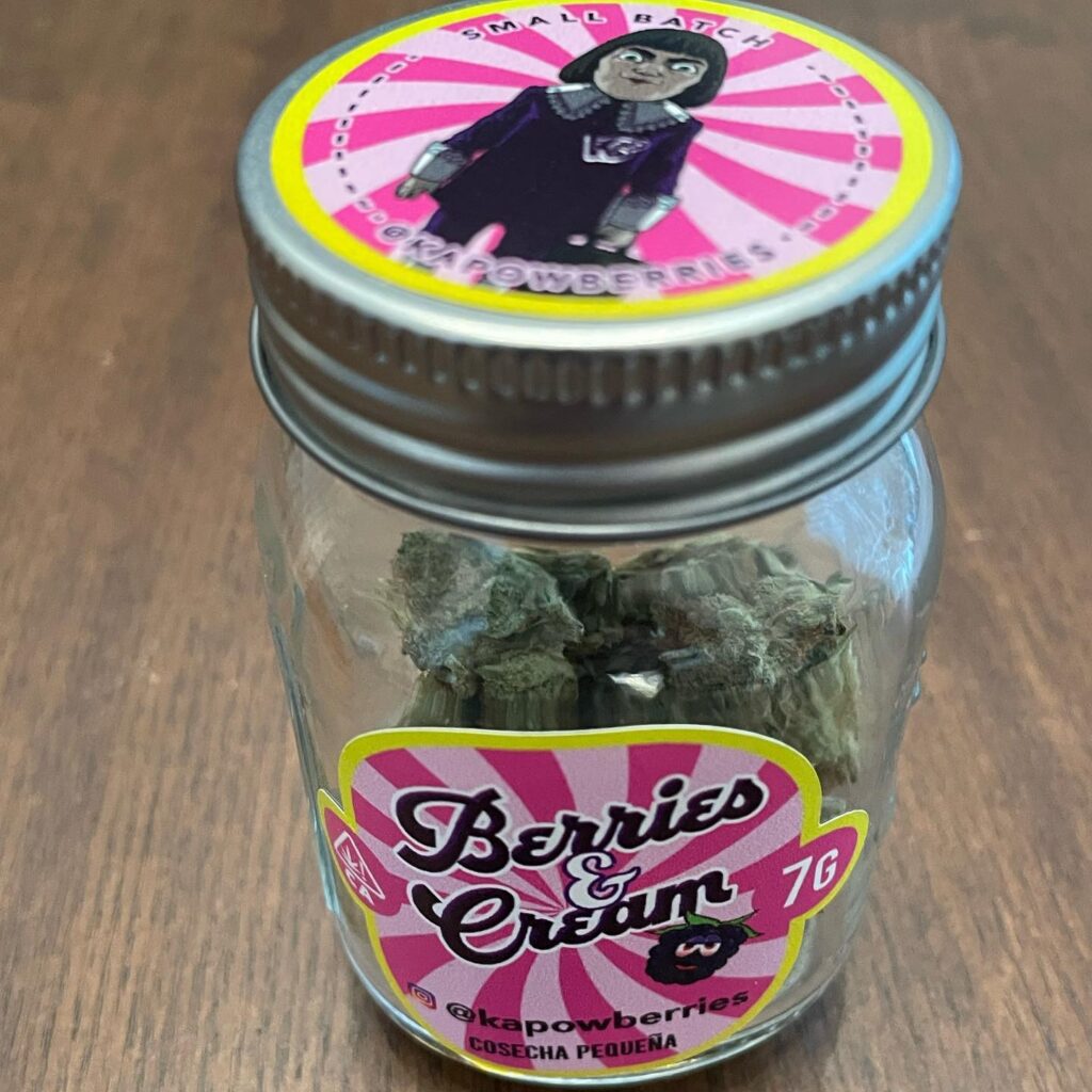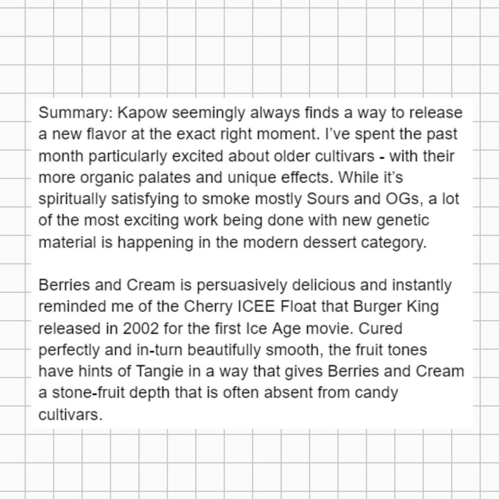 Flavor: Berries and Cream is properly named and delivers a clear representation of a tried and true profile. Berries and Cream has the sweetness that feels at home in the canon of contemporary candy strains. The inhale has a tinge of strawberry candy, which immediately gets drowned in a cooling sweet cream that closely resembles Cool Whip. The creamy qualities extend to the texture of the smoke and appearance of the ash, which makes for an overwhelmingly enjoyable experience. Deceptively potent, Berries and Cream has hashy effects – calming and giggly with gentle pressure in my forehead.